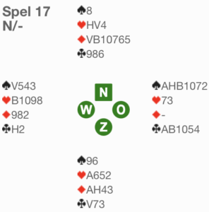 Op dit spel toonde Hans vervolgens zijn afspeltechniek. Nadat Zuid met ru H was gestart en hij de troeven had getrokken, realiseerde hij zich dat er 3 ha’s weg moesten op de kla’s. Hij moest derhalve de kla V eruit snijden. En niet voor het eerst deze competitie ging de snit de goede kant op.