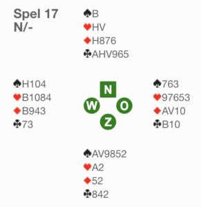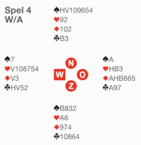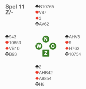 Zuid 1 Ha en Noord heeft een drie kaart steun. Bij ons zit dit in 2 SA (10-13 met 3 kaart en ja ik heb em wat opgewaardeerd). Zuid heeft nu wel een aardige hand en zou een milde slempoging kunnen doen. Aldus geschiede bij ons en voor we er erg in hadden zaten we in 6 Ha met 23 punten samen. Helaas deed het 4/1 zitsel in troef ons de das om, hoewel het spel – met open kaart – nog steeds te maken is.