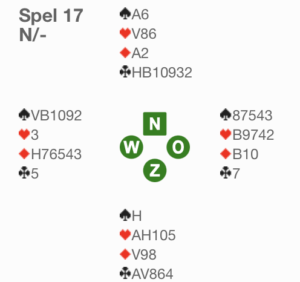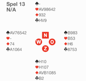 Tja, nu mag Zuid weer. Noord heeft niet veel sch’s, een 3 kaart ha en 1 Kla geopend. Ergo, er zitten zeker 4 kla’s. Dus je weet wat er troef moet worden. Nu nog op welk niveau. Ru AH en Kla H lijkt voldoende, dus ik denk dat je op 6 Kla moet ‘gokken’. En dat je 13 slagen gaat maken, had je nooit verwacht.