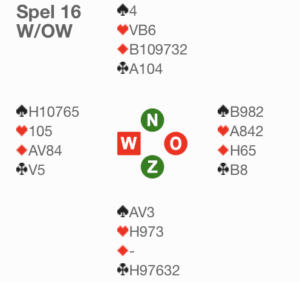 Laten we dan spel 16 maar eens onder de loep nemen. Hier doet zich het bijzondere feit voor dat aan de meeste tafels OW een deelscore zal mogen spelen terwijl het slem is voor NZ! Heel bijzonder, kijk maar mee: